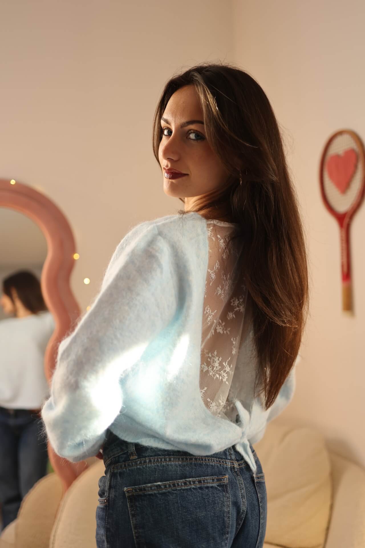 À l’arrière : un sublime dos nu en dentelle florale, délicat et ultra féminin, qui transforme une maille cosy en pièce waouh.